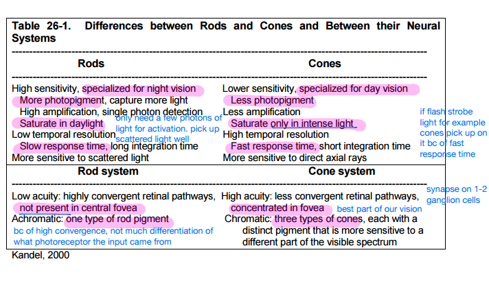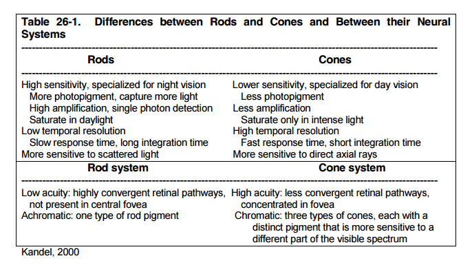 Just as different types of mechanoreceptors result in submodalities within the somatosensory system, ROD and CONE photoreceptors (named for the shape of the photoreceptor outer segment) are the source of separate submodalities within the visual system with numerous functional and anatomic distinctions.