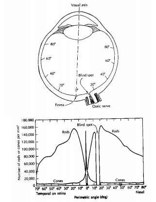 Attached pic: Note the concentration of cones in the fovea and absence of rods in the same area.