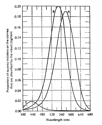 T or F: Each cone has a pigment, which preferentially absorbs light in the red, green or blue wavelength.