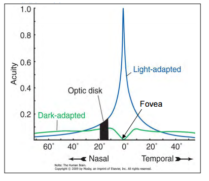 Explain this graph. Describe the reaons for changes in acuity in the different parts of the retina.