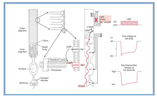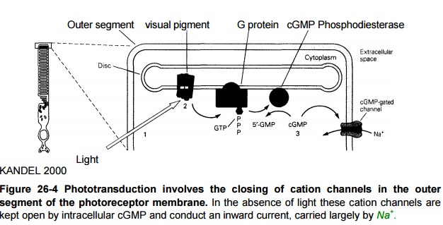 When light strikes the photoreceptor (illustrated in pic by a rod cell, same process occurs in cones) the cGMP-gated channels are closed by a three-step process. (1) Light is absorbed by and activates pigment molecules (rhodopsin in rods) in the disc membrane (the green rectangle in the rhodopsin molecule represents the light absorbing portion, retinal). (2) The activated pigment stimulates a G protein (transducin in rods), which in turn activates cGMP phosphodiesterase. This enzyme catalyzes the breakdown of cGMP to 5’-GMP. (3) As the cGMP concentration is lowered, the cGMP-gated channels close, thereby reducing the inward current and causing the photoreceptor to hyperpolarize.