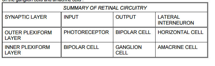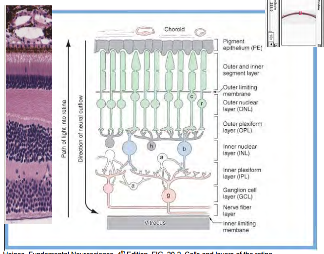The retina has five major classes of neurons arranged in layers: photoreceptors (rods, r, and cones, c), bipolar cells (b), horizontal cells (h), amacrine cells (a), and ganglion cells (g). The ganglion cell axons leave the retina to form the optic nerve. Photoreceptors synapse on the bipolar cells and the horizontal cells. Bipolar cells in turn synapse on the ganglion cells and amacrine cells.