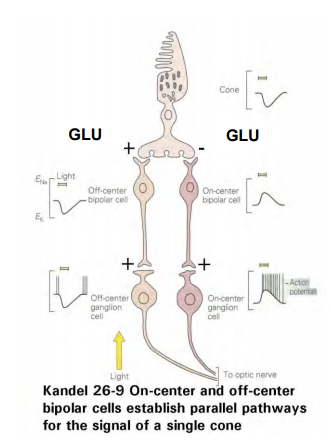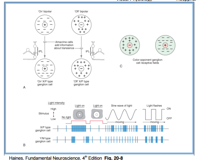 In contrast, the X/M type ganglion cells receive input from only a few bipolar cells and thus have small receptive fields. They are specialized for fine resolution, color vision and respond primarily to hi intensity light.