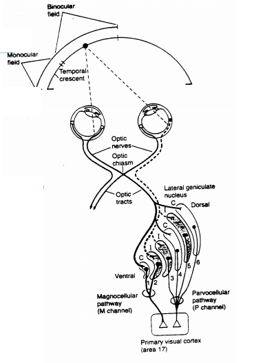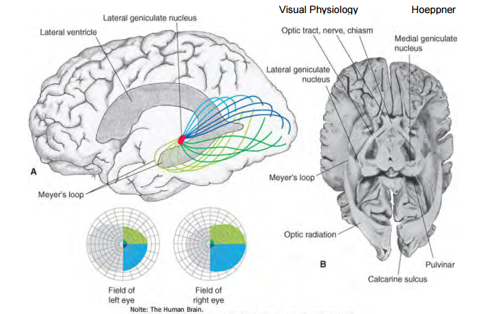 Optic radiations: Fibers representing the superior potion of the visual filed travel from the lateral geniculate nucleus into the temporal lobe (through Meyer’s loop) on their way to the visual cortex. Damage to this loop causes a superior quadrantanopia in the contralateral visual fields of both eyes.
