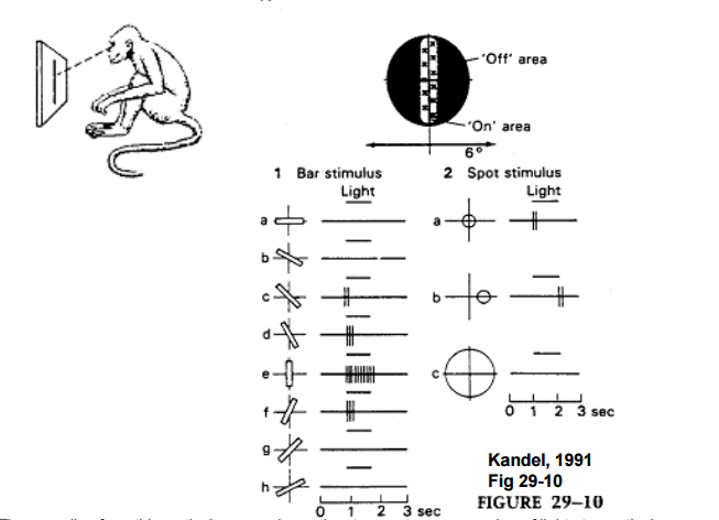 The recording from this cortical neuron shows the strongest response a bar of light at a particular orientation at a particular location in the visual field. For simplicity only a neuron with a receptive field with a vertical axis of orientation is shown in this figure. In fact, all axes orientation-vertical, horizontal and various obliques- in each region of the retina are represented in the primary visual cortex. This elongated receptive field apparently is based on convergence of selected neurons in the lateral geniculate nucleus to neurons in the cortex with partially overlapping receptive fields. The cortical cells are relatively unresponsive to diffuse light or small spots of light.
