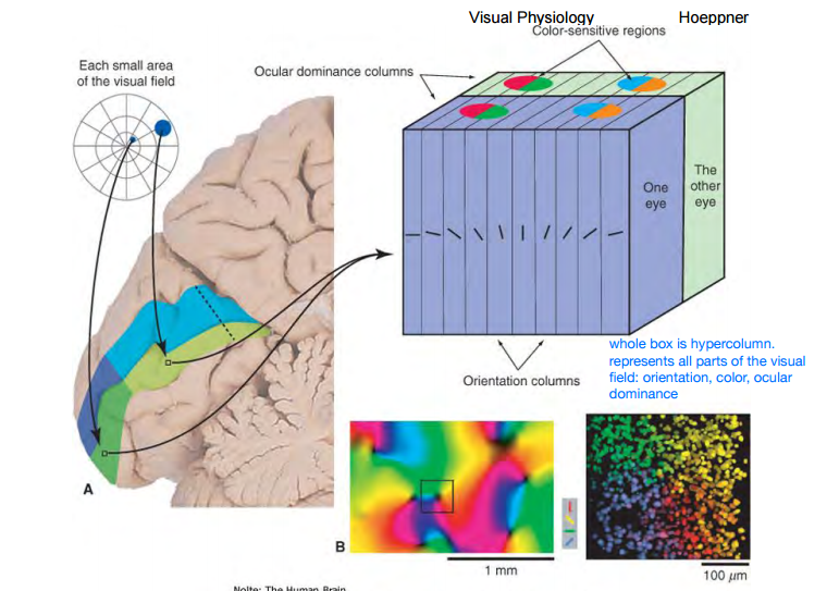 Hypercolumn: a collection of vertical columns in the visual cortex roughly 500-1000 um on a side in which each column represents the processing of a particular visual feature. All of the cells within the hypercolumn have receptive fields in the same part of the visual field. The size of the visual field represented by a given hypercolumn is one receptive field in width. Cells in hypercolumns representing the central part of the visual field have much smaller receptive fields than those in hypercolumns representing the periphery.