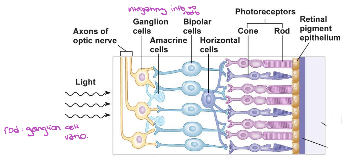 magnocellular cells are large, integrate signals from rods, involved in movement, depth and irradiance