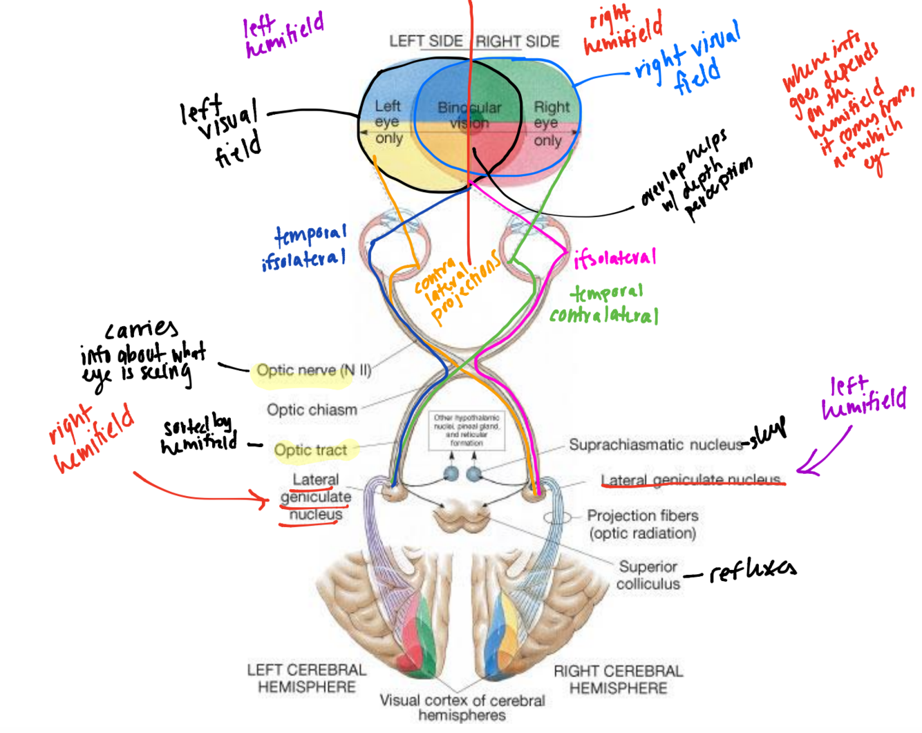 contralateral: info goes to the opposite side of the brain than it was recieved from