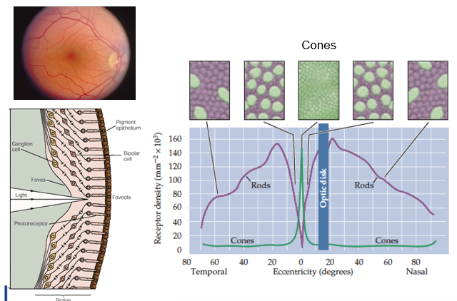 See picture → Cones have a low concentration in the peripheral part of retina, while they’re highly concentrated around the foveola. And vice versa with rods.
