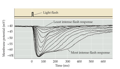 When light hits photoreceptor → cells respond with graded change in potential → hyperpolarization (exclusive feature of visual system).