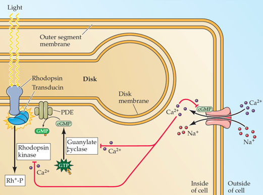 In the presence of light, Ca2+ is able to inhibit (the formation of) cGMP or is able to inhibit the rhodopsin kinase. By doing this, the sensitivity of light-sensitive receptors is modulated.