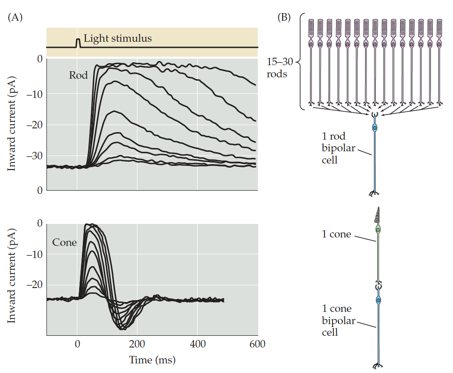 In line with the difference in connectivity of rods and cones, there’s also a difference in the response to light. Explain this difference.
