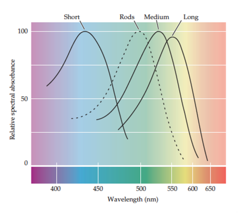 There are three different cones for different wave lengths of light. Describe these three different cones.