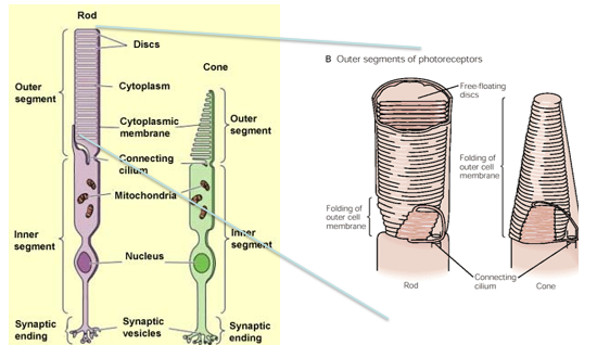 Inner and outer segments → rods have longer outer segments that contain a lot of optic discs compared to cones that have shorter outer segments with fewer optic discs.