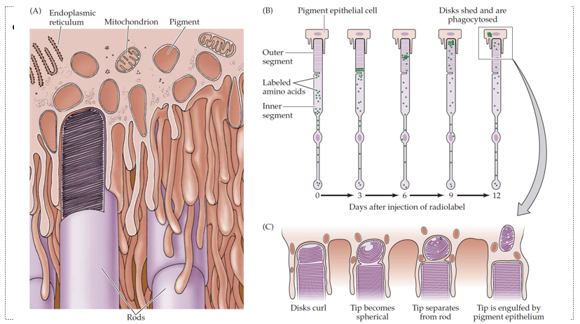 Optic discs are part of the membrane of the pigment epithelial cells and enlarge the membrane surface. They’re removed regularly, which takes about 12 days to replace all the optic discs.