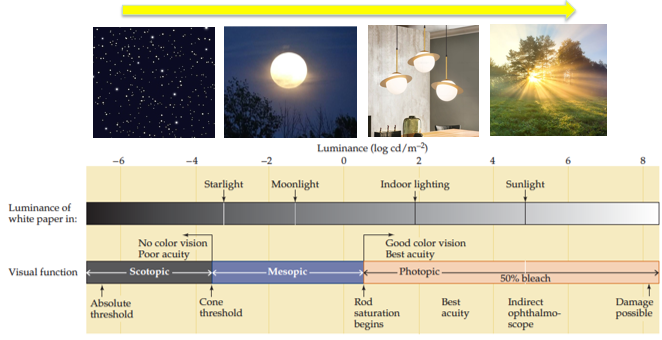 Rods are very sensitive to light (absolute threshold), while the threshold for cones lies further. At indoor lighting, rods become saturated. Cones give the best resolution to size, shape and color and become bleached when light increases.