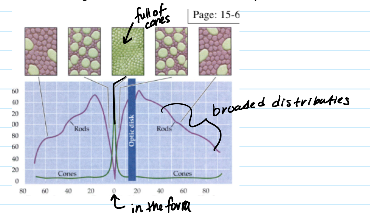 Rods are distributed throughout the retina except for fovea.