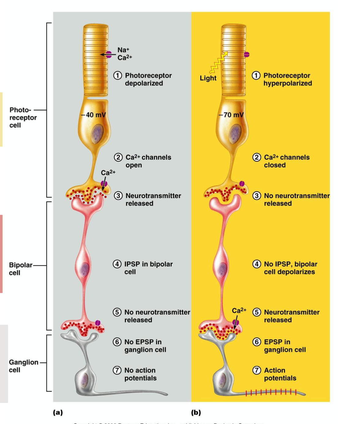 - electrical reponses to light: EPSP in ganglion cell, depolarizes, AP generated