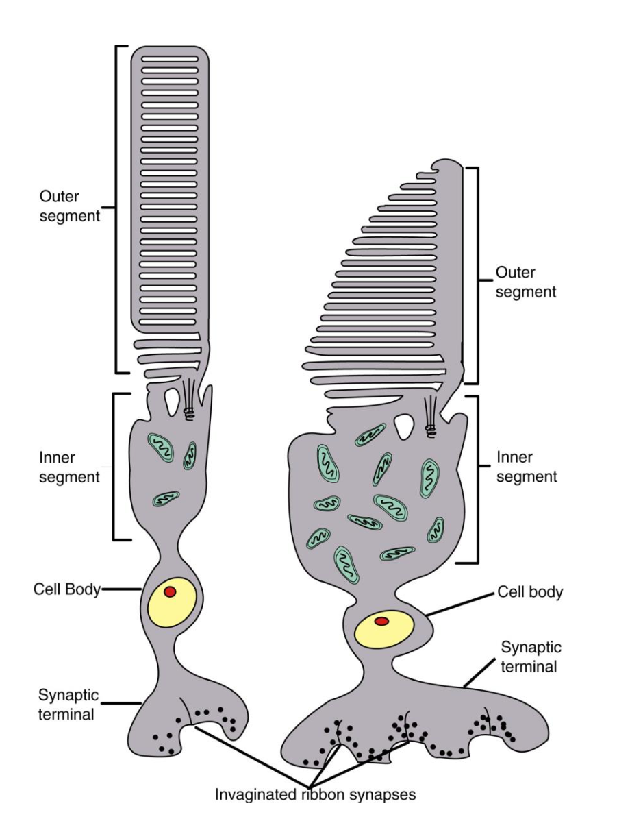 - neurotransmission: constantly releases glutamate (only conc changes) which binds mGluR6 on bipolar cell