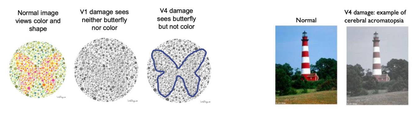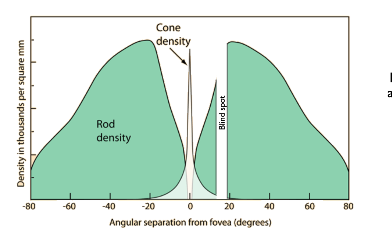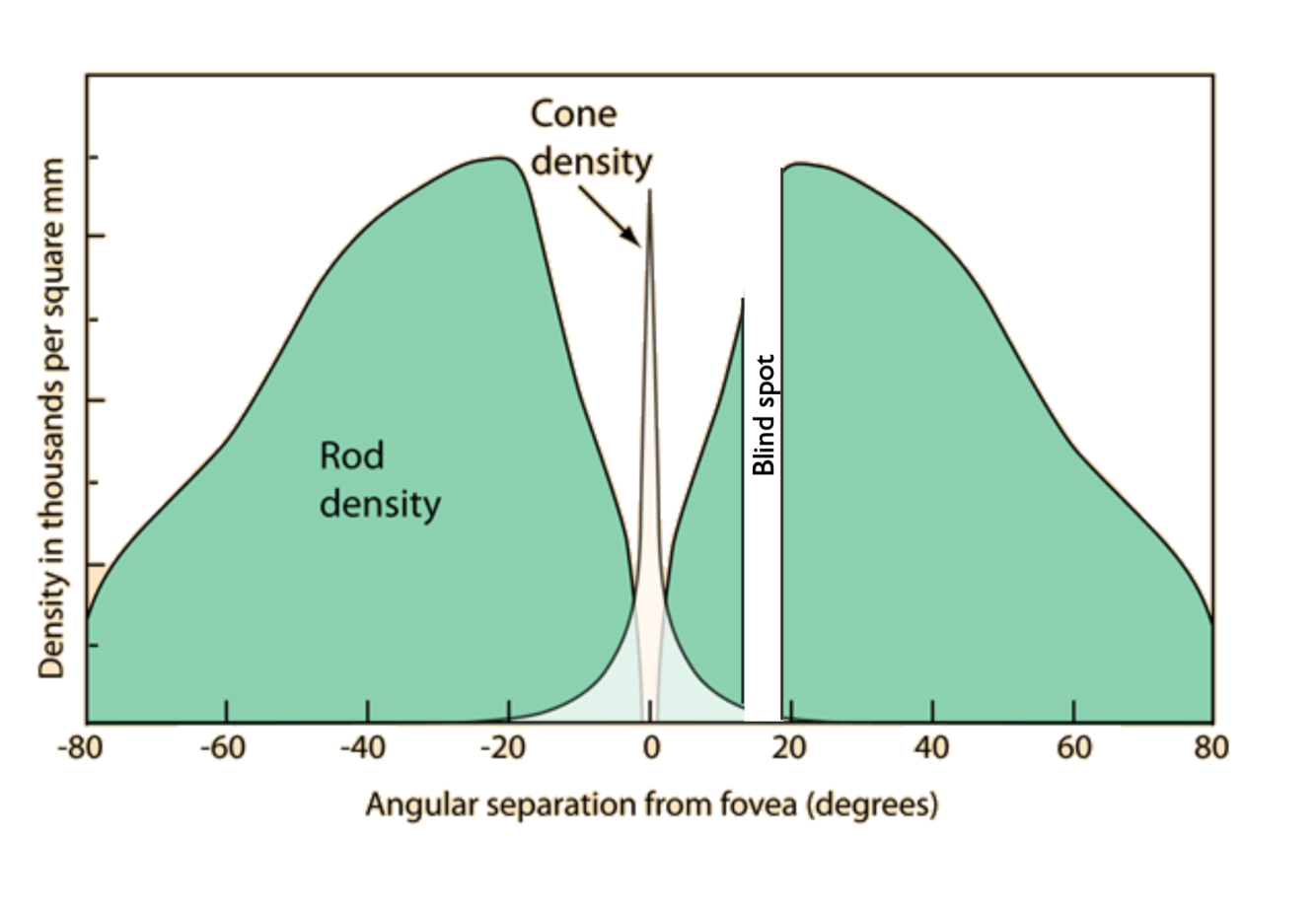 (example Dr. Pierce gave was looking at the stars at night, if you look about 20 degrees of center from a star, the star will appear to shine brighter in your peripheral than it will looking directly at it because the density of rods (brightness/light sensitivity) is greatest at this point)