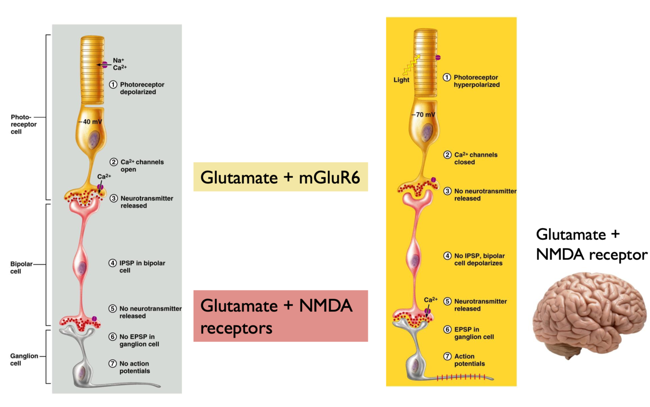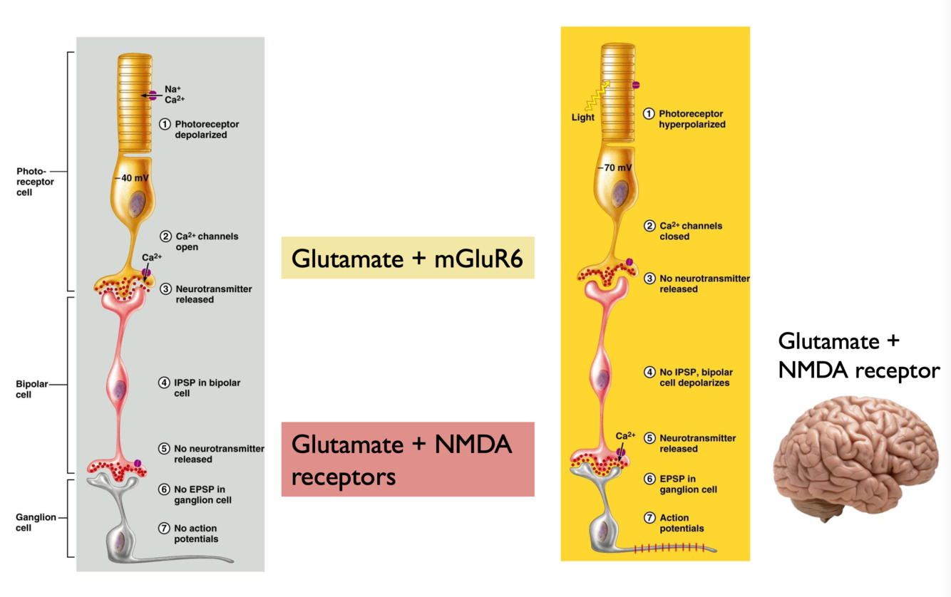 - neurotransmission: EPSP results in release of glutamate which binds NMDA receptor on ganglion cells