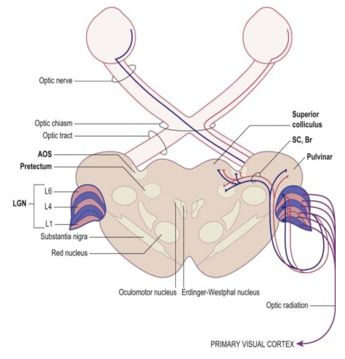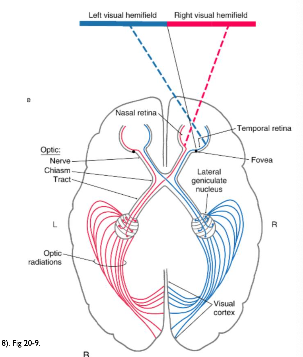 This has to do with the way the light from the object is refracted into the retina, left visual field is sent to left eye nasal retina (goes to right side of brain) and right visual field is sent to right nasal retina (goes to left side of brain)