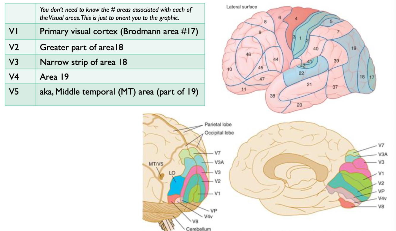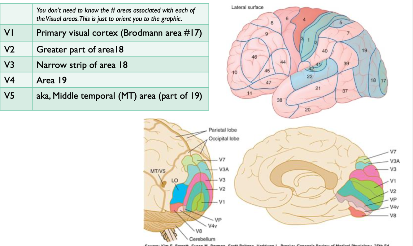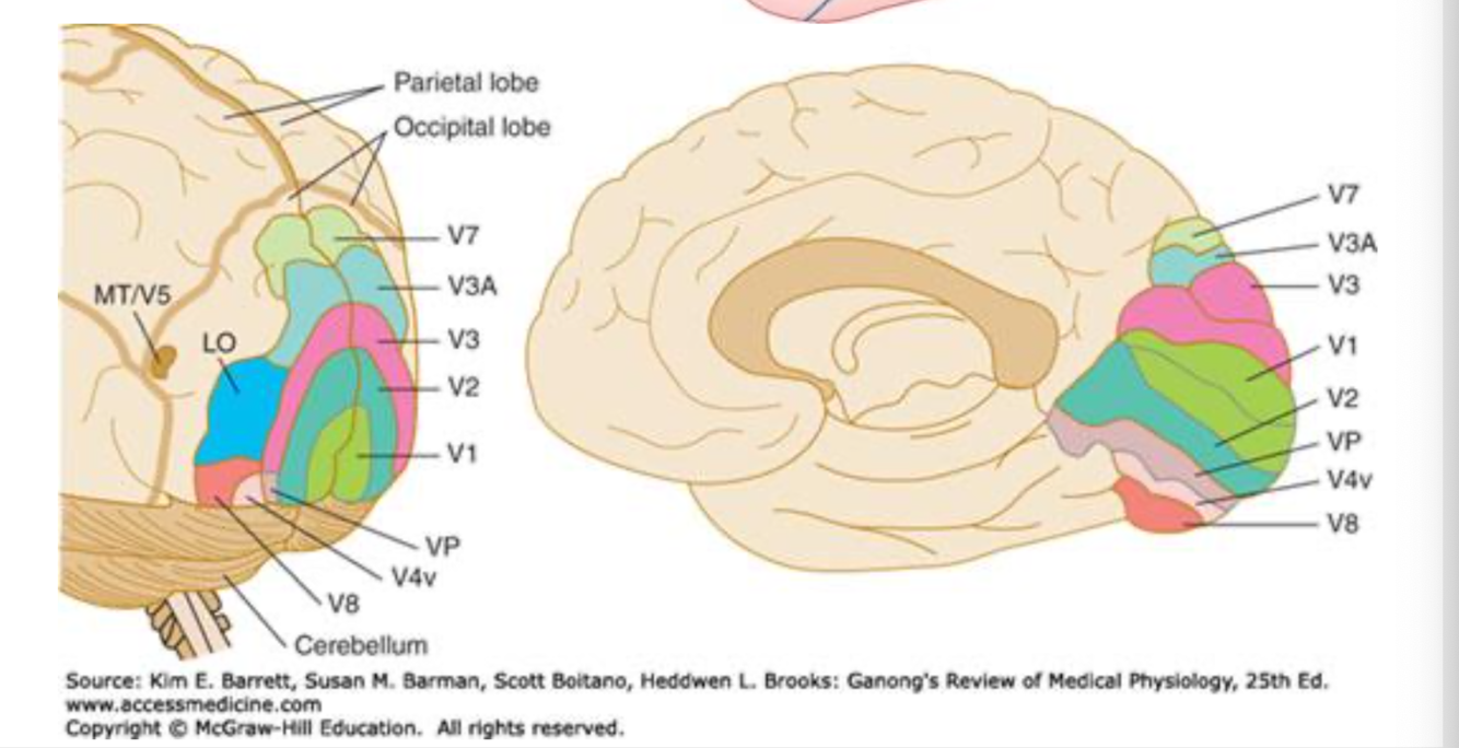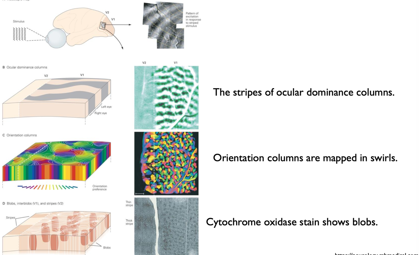 ocular dominance columns (eye laterality), orientation columns (angular distinction), and blobs (color vision)