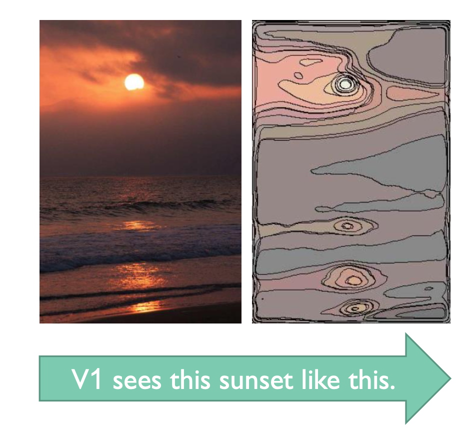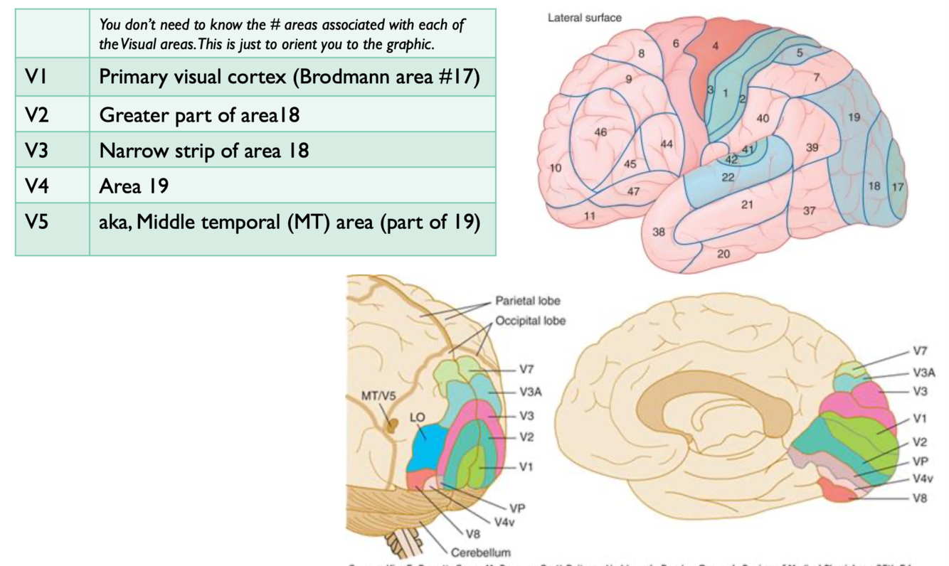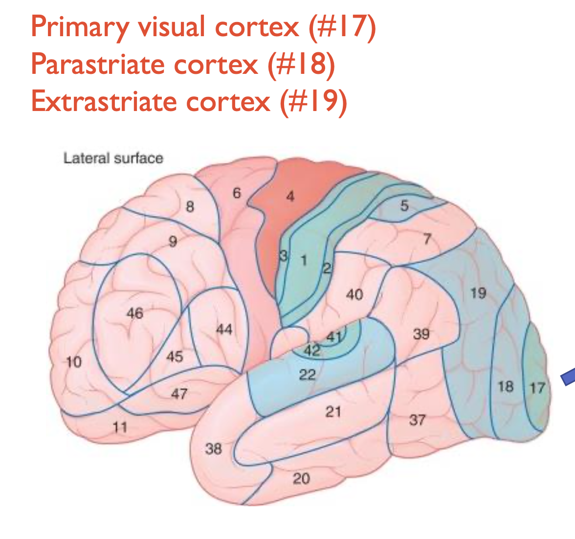 ocular dominance columns (eye laterality), orientation columns (angular distinction), and blobs (color vision)