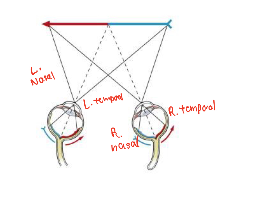 -Right nasal fibers-layers 1,4 and 6 of left LGN