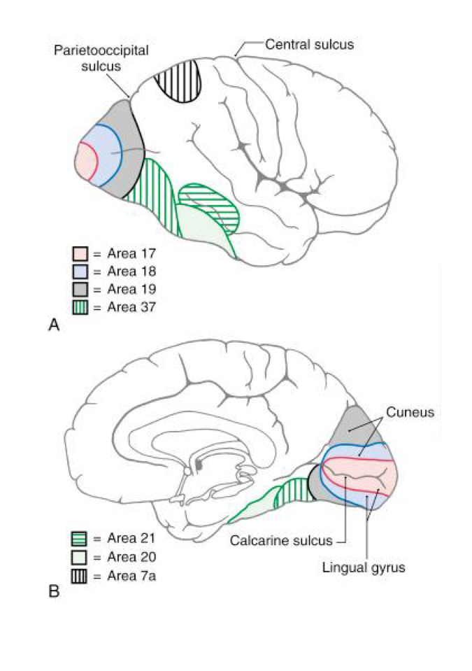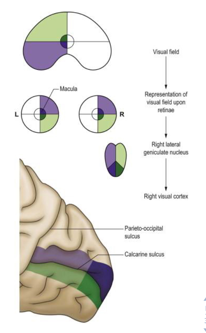 Secondary neurons from LGN that are relaying information to the primary visual cortex (striate cortex) [on upper and lower banks of calcarine sulcus]