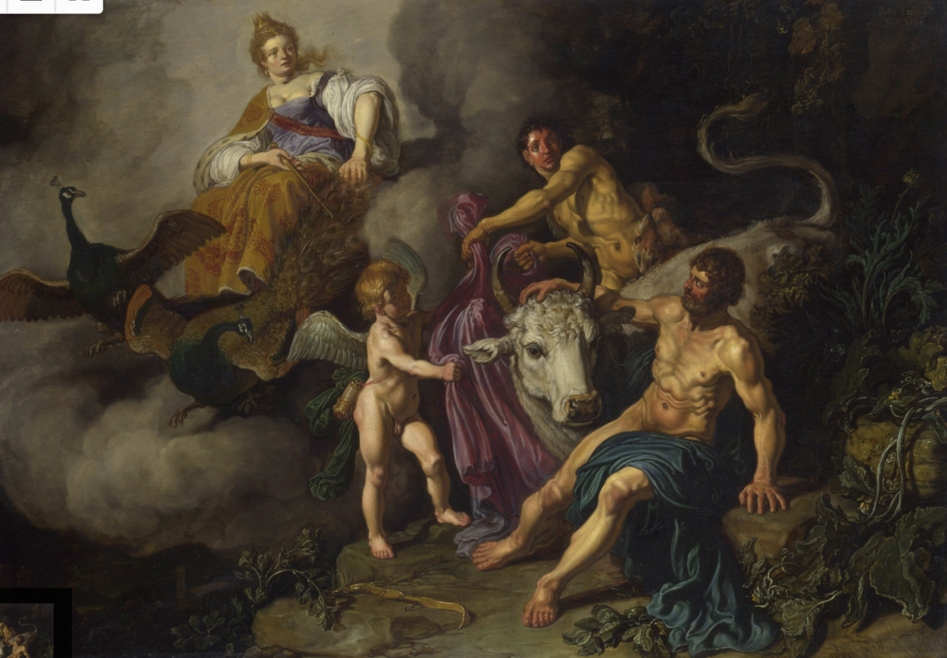 Zeus turned Io into a cow before Hera could see her, but Hera knows that Zeus is being unfaithful so she demands to keep the beautiful cow as a gift