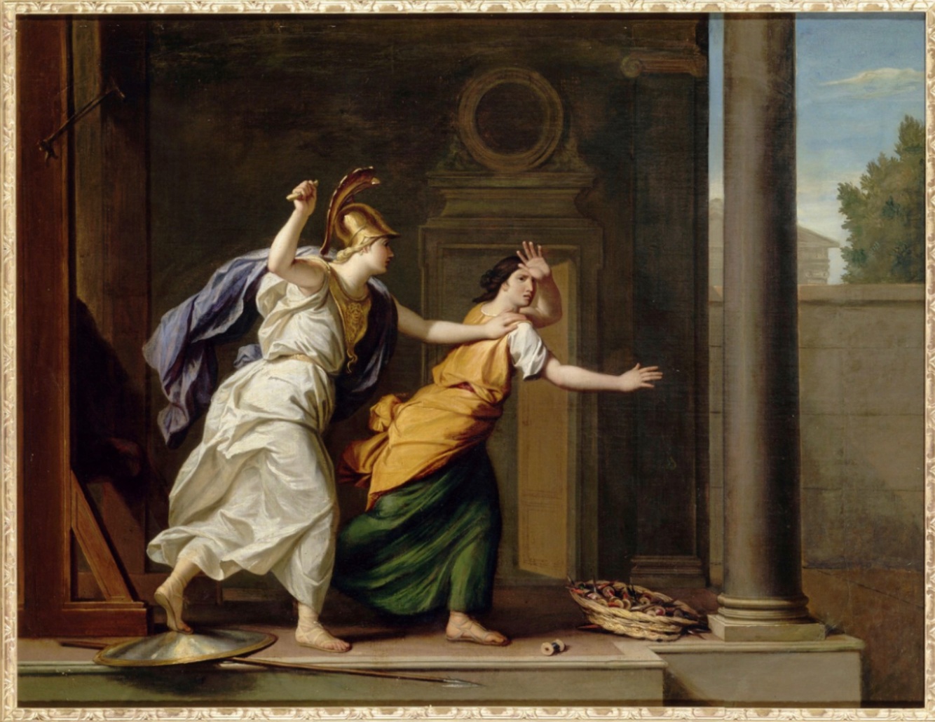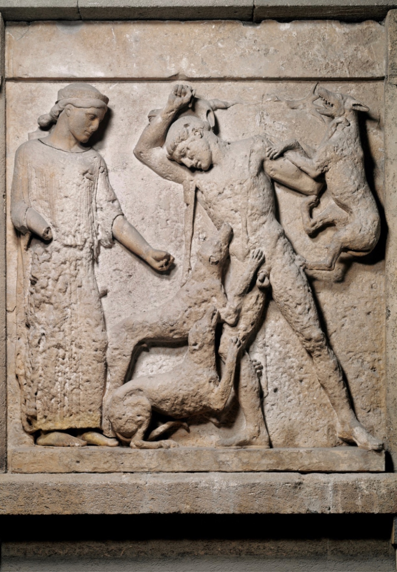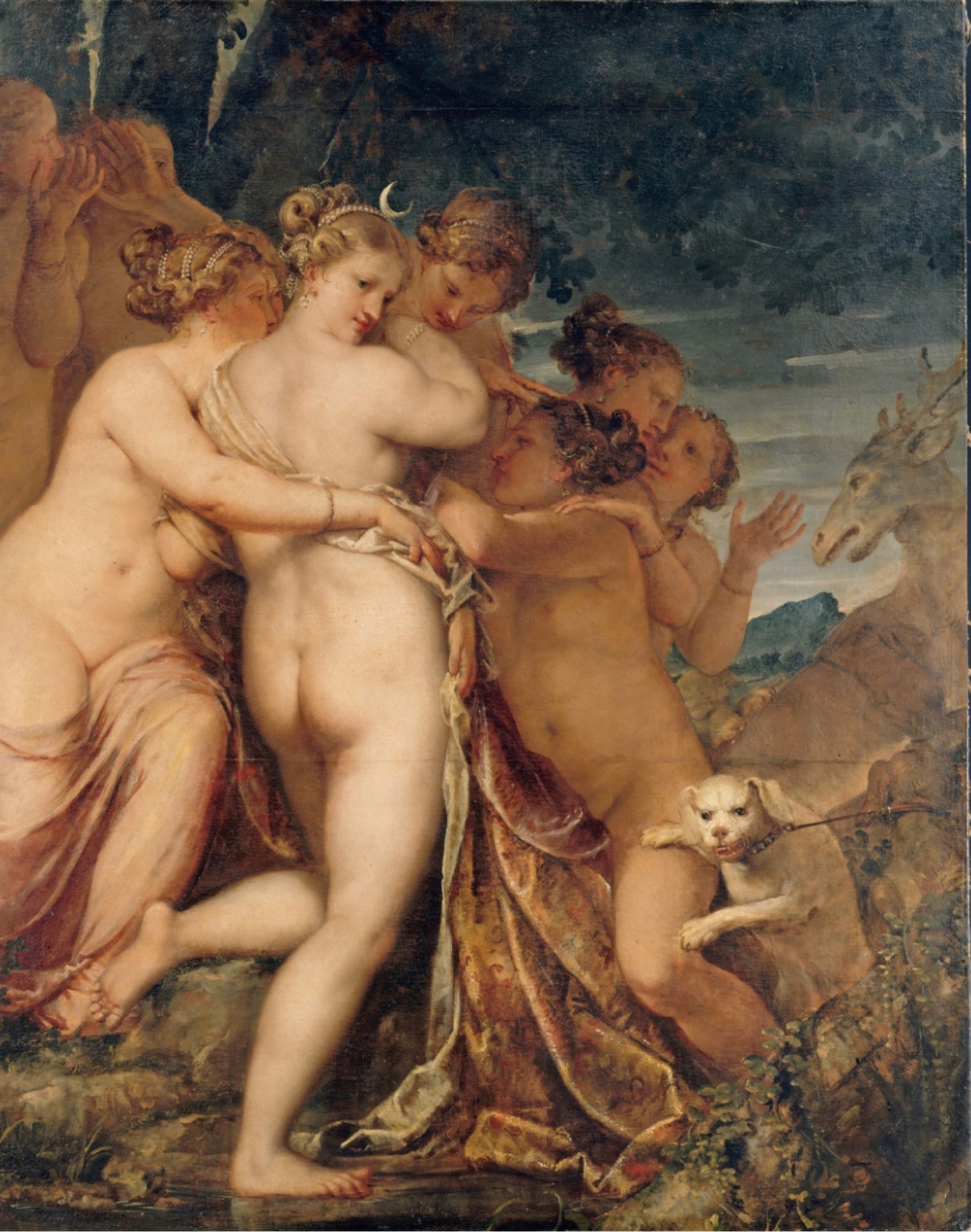 Diana (Artemis) is punishing Actaeon for seeing her nudity while she was bathing by turning him into a deer and his own dogs kill him