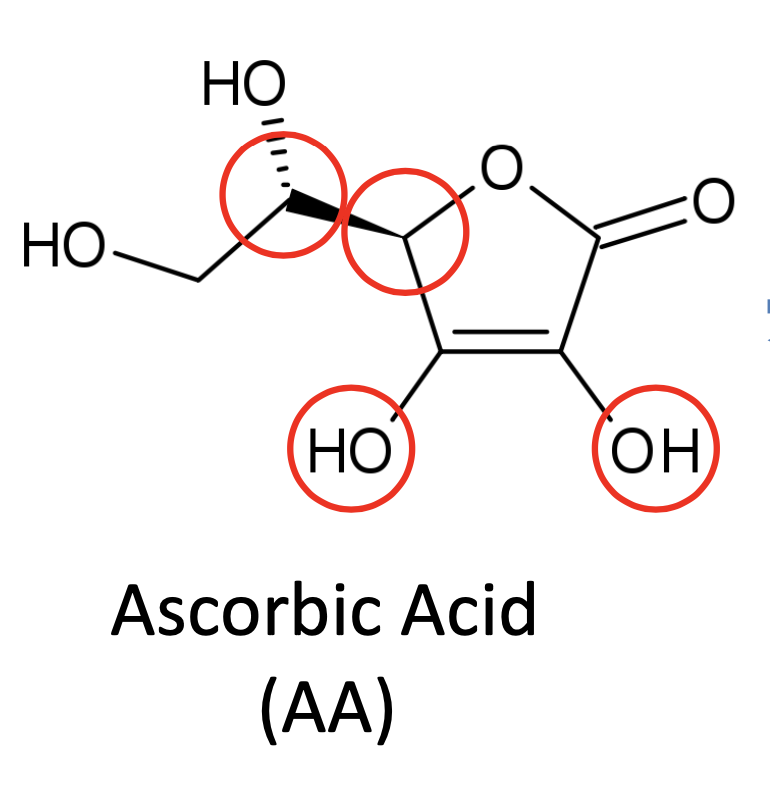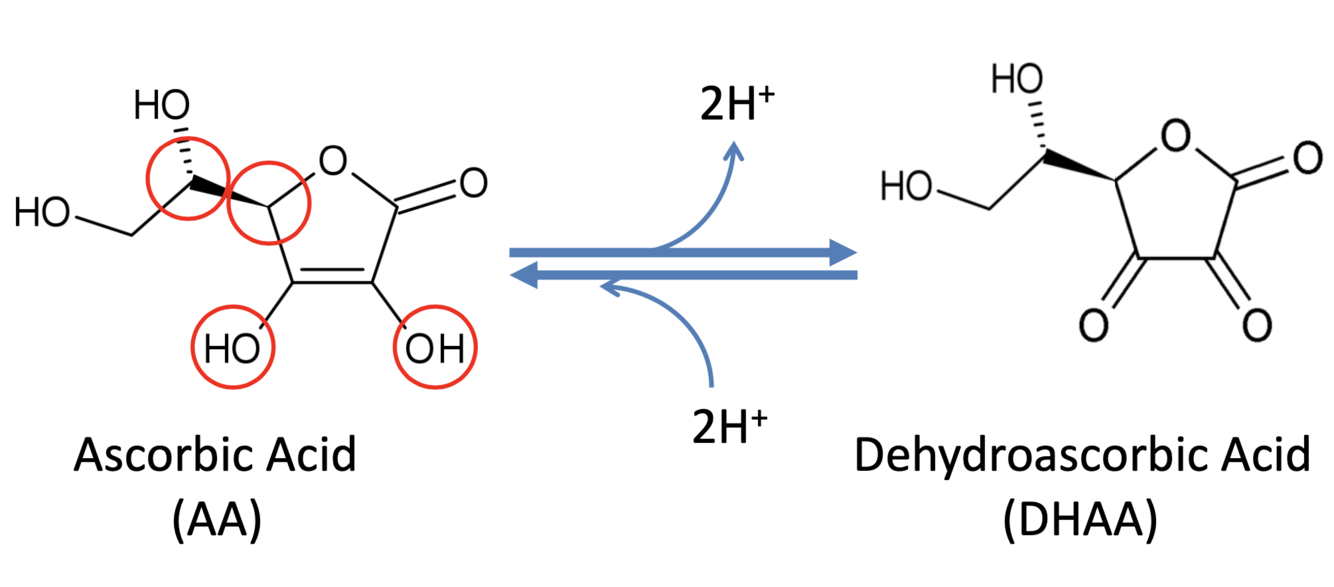 * Readily accepts hydrogens to become AA. The reversibility of this reaction is key to vitamin C’s role as an antioxidant.
