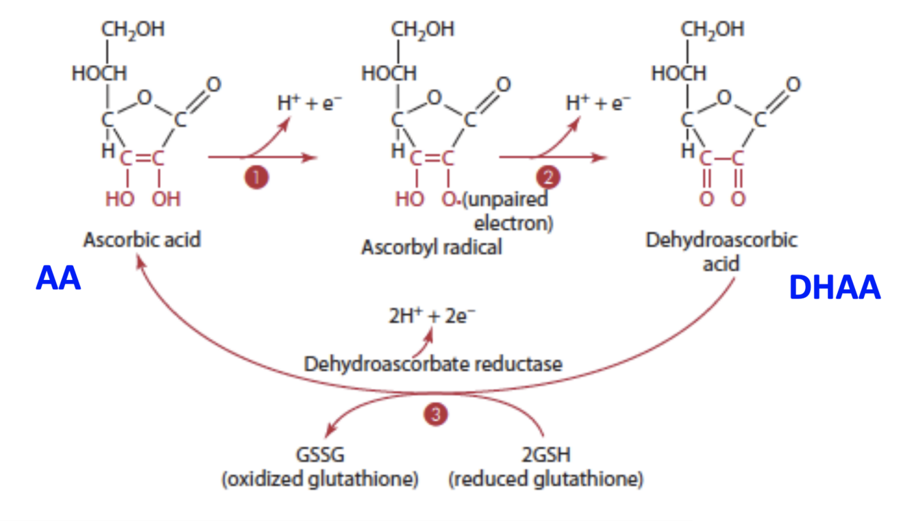 AA is oxidized to DHAA which may be reduced back to ascorbate by GSH and NADPH (required to recycle GSSG back to GSH)
