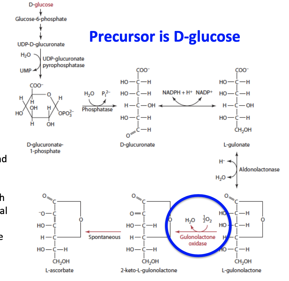 starts with D-glucose as the precursor and have the enzyme gulonolactone oxidase to make ascorbic acid