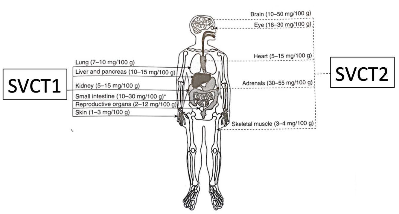 * SVCT2 – high affinity, low capacity (↑ Km)