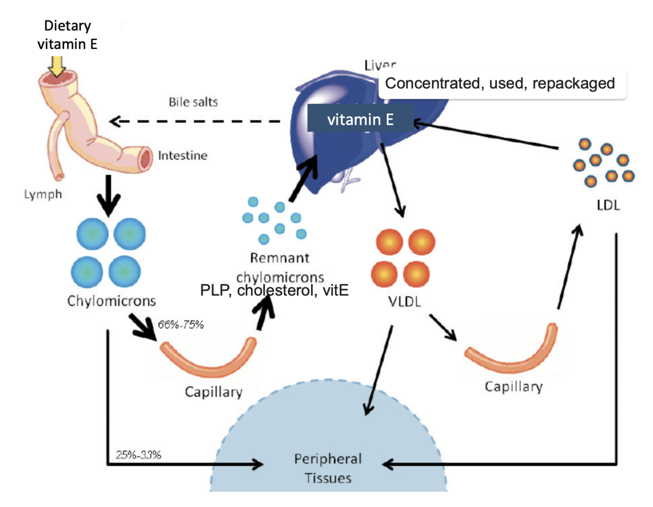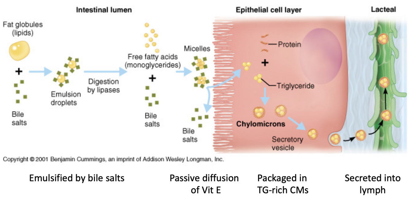 VitE isoforms are non-polar molecules that are incorporated into micelles in the gut and enter enterocyte via passive diffusion where they are incorporated into the middle of Chylomicrons and secreted into lymph.