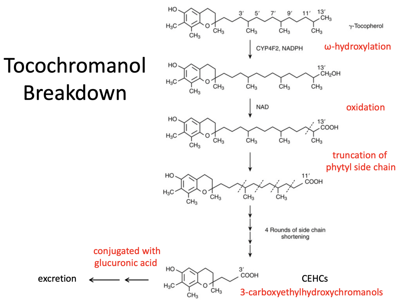 * truncation of the phytyl side chain to 2’-carboxyethylhydroxychromanol metabolites (CEHC’s)
