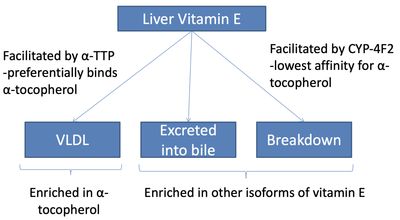 α-TTP -preferentially binds α-tocopherol repackaging it while CYP-4F2 has lowest affinity for 𝝰-toco so other isoforms are broken down/ excreted.