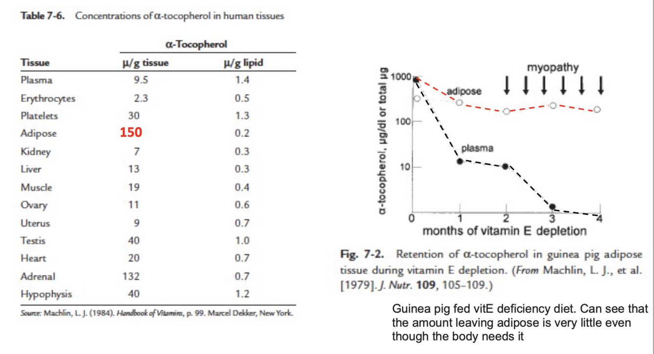 * 90% of vitamin E is stored in white adipose tissue – very immobile pool and cannot adequately supply vitamin E to circulation in times of need