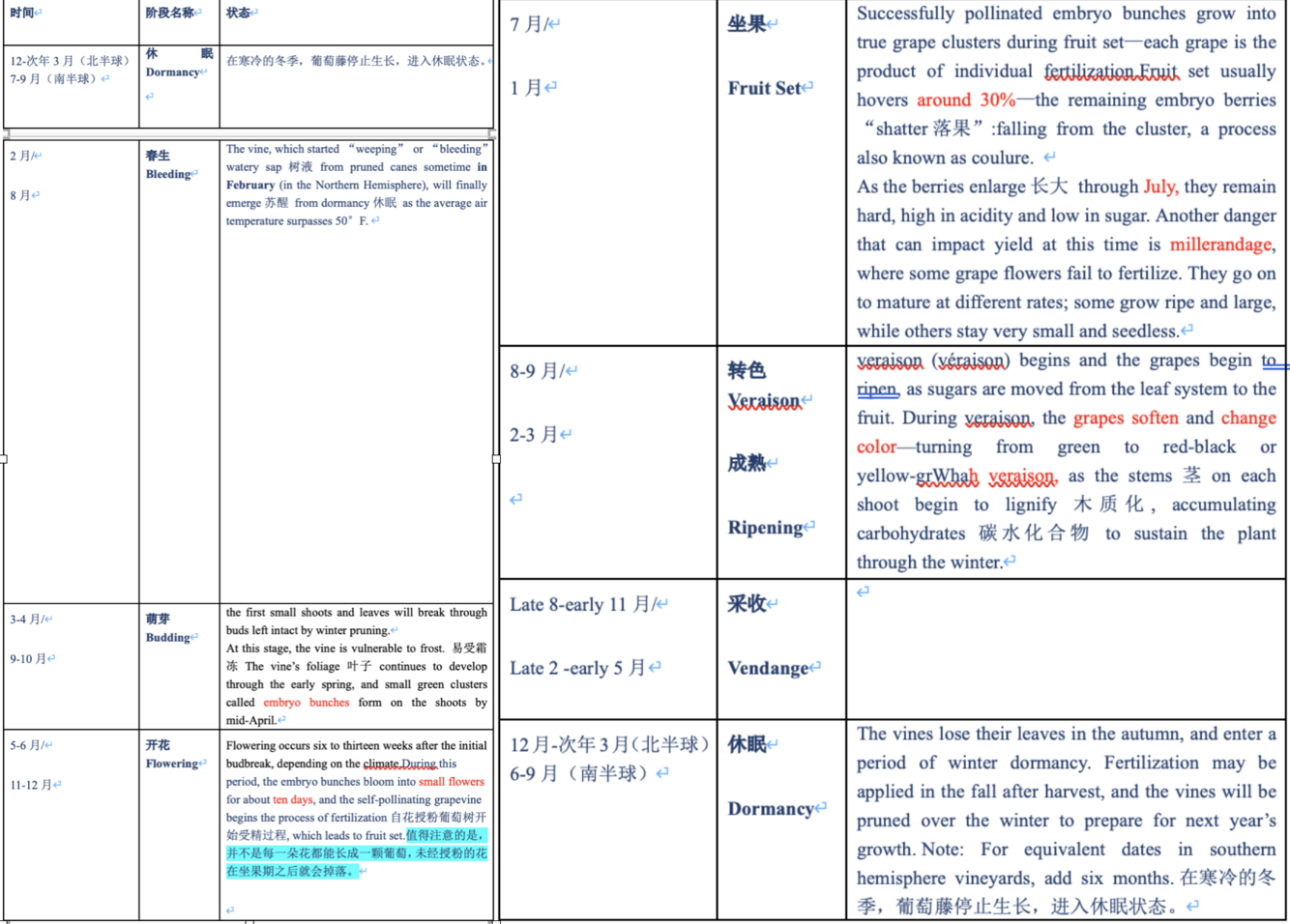 Flowering, May-June, vines bloom, self-pollinating grapevine begins the process of fertilization which lead to fruit set自花授粉葡萄树开始受精过程。