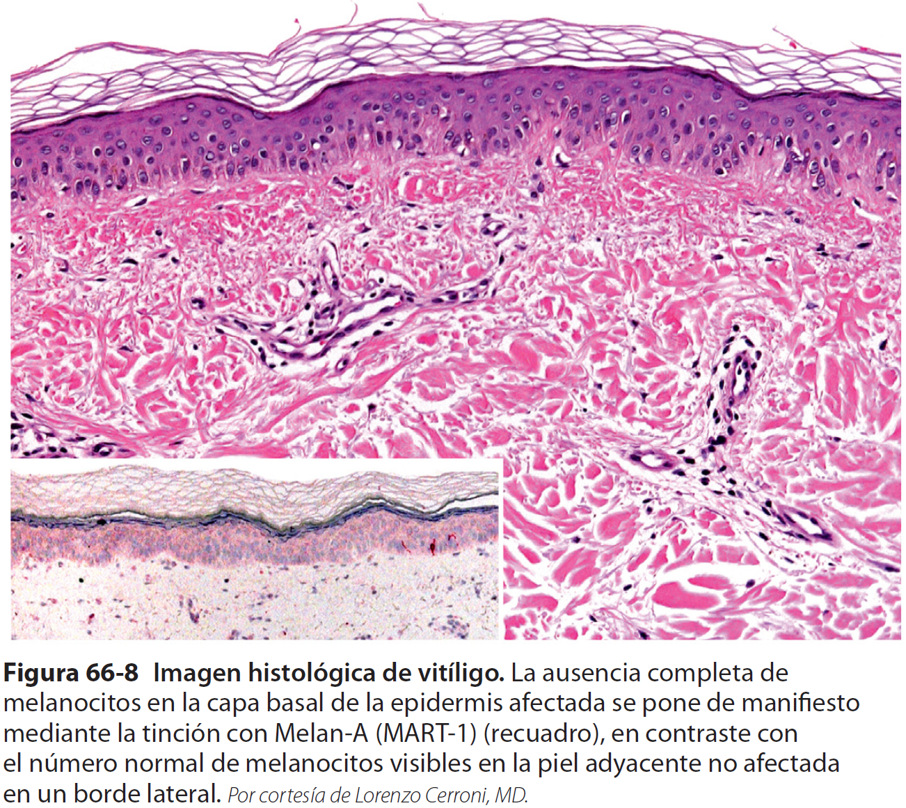 EN LAS LESIONES DE VITÍLIGO, LOS MELANOCITOS ESTÁN AUSENTES O SE PRESENTAN EN NÚMERO MUY BAJO (FIG. 66-8).