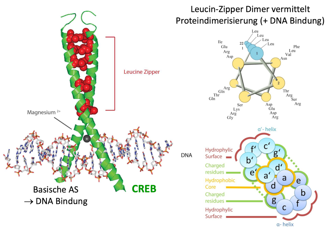 Leucin-Zipper-Dimere vermitteln Proteindimerisierung (und DNA-Bindung über basische AS wie Arginin).