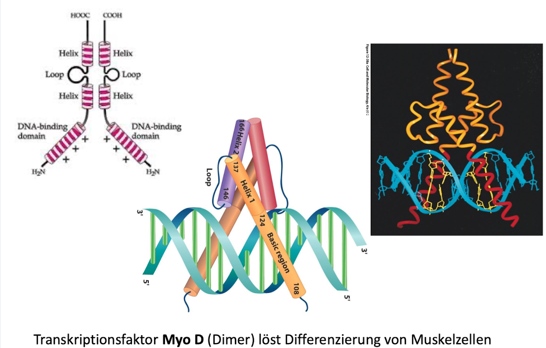 Helix-Loop-Helix-Motive binden die DNA an charakteristischen palindromischen Sequenzen (E-Box) mit der Basenabfolge CACGTG.