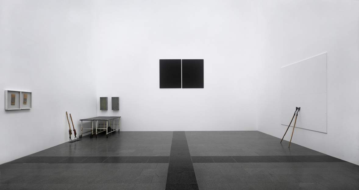 Installation mit Werkzeugen (outils), Fett, Zeitung, kreide (craie), Schultafen (tableau d’école).
