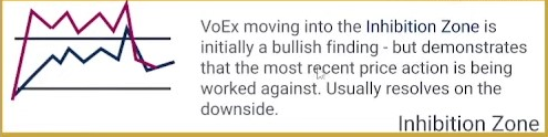 Voex moving into the inhibition zone is initially a bullish finding - but desmonstrates that the most recent price action is being worked against. Usually resolves on the downside.