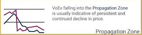 Voex falling into the propagation zone is usually indicative of persistent and continued decline in price.