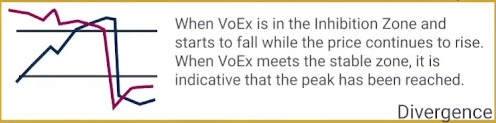 When voex is in the inhibition zone and starts to fall while the price continues to rice. When Voex meets the stable zone, it is indicative that the peak has been reached.