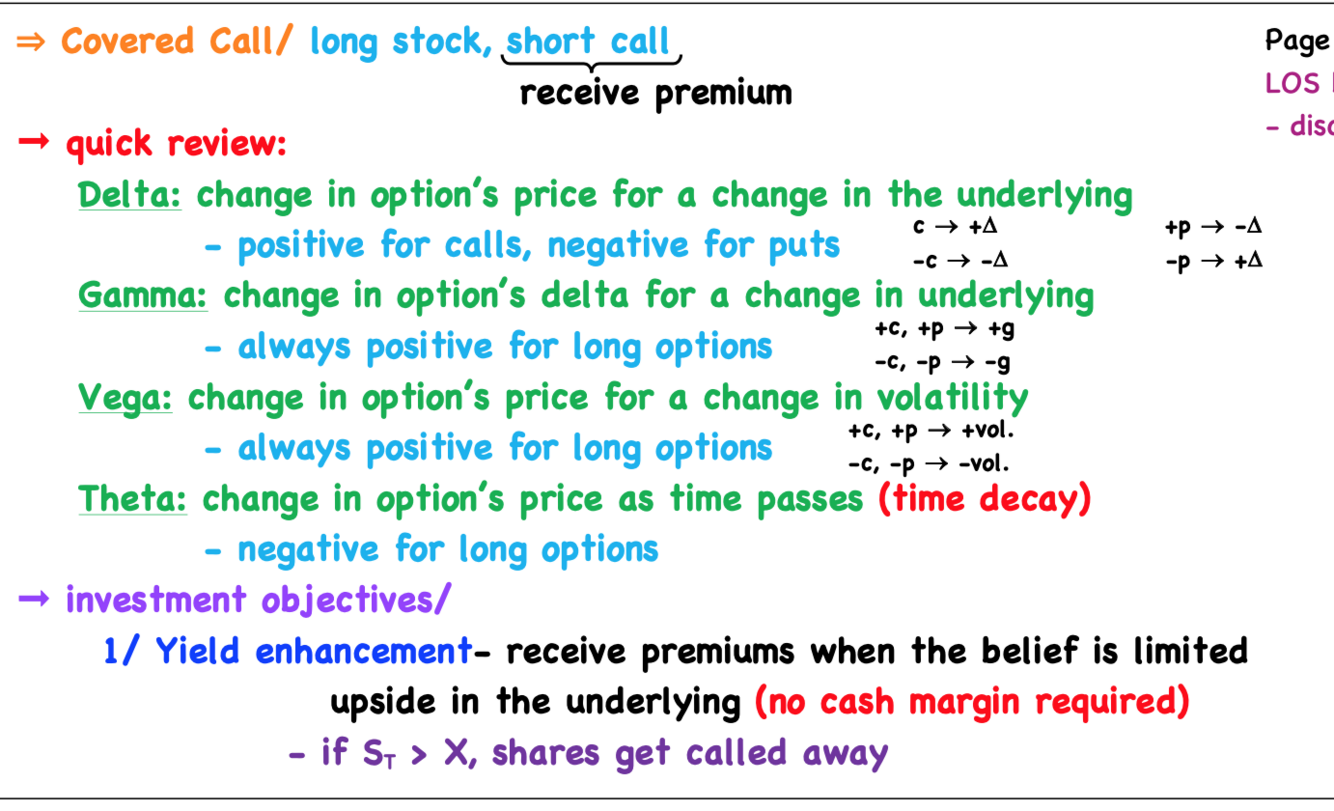 What is a covered call and what are the greeks? How does yield enhancement occur with a covered call?