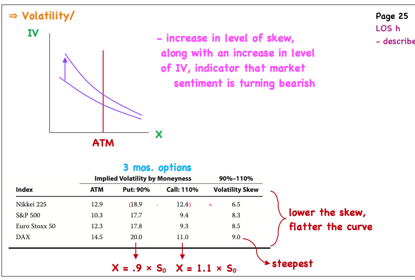 Negative or Reverse Skew: If the skew is negative, it means that OTM put options have a higher implied volatility than OTM call options. This is often seen in equity markets where investors are more concerned about price drops and hence are willing to pay more for put options to protect their investments. A negative skew suggests that the market is expecting a downward price movement.